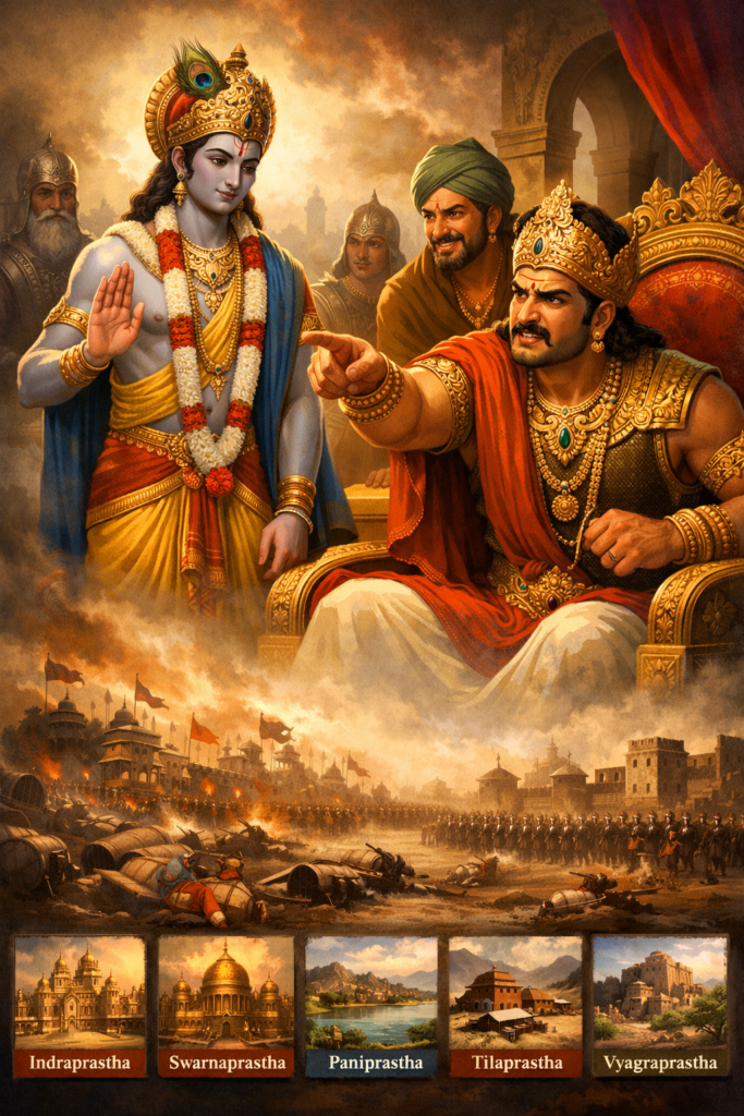 कृष्णांनी पाच गावांची नावे सांगितली — इंद्रप्रस्थ, स्वर्णप्रस्थ, पाणीप्रस्थ, तिलप्रस्थ आणि व्याघ्रप्रस्थ. हे ऐकताच सभेत उपस्थित असलेल्या शकुनीची कूटनीती जागी झाली. त्याने ओळखलं की ही पाच गाव सामान्य नाहीत. आजच्या काळात तुलना करायची झाली तर ही गाव मुंबई, दिल्ली, चेन्नई, बेंगलोर आणि सुरतसारख्या महत्त्वाच्या केंद्रांसारखी होती. ही गाव दिली, तर सत्तेचा कणा मोडेल.